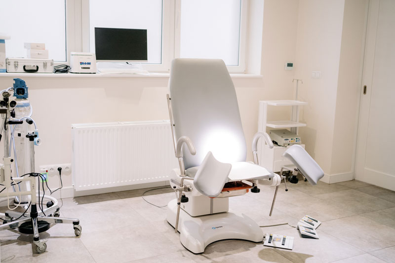 Przestronna sala, wyposażona w wygodny regulowany trzema silnikami elektrycznymi fotel ginekologiczny, bezproblemowo ułoży Cię w wymaganej do badania pozycji. Nawet jeżeli masz problemy z poruszaniem się, otyłością lub z odwodzeniem nóg w stawach biodrowych, pozycja badania pozostanie optymalna dla Ciebie i lekarza.